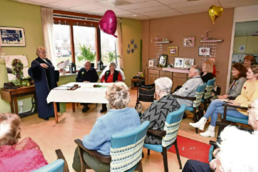 ’She’s always a woman’ van Billy Joël klinkt door het meegebrachte bluetooth-speakertje als de BABS met de twee bloemetjes strooiende bruidsmeisjes, die Jan ook kennen van de dagbesteding, de rode loper afloopt. Nagenoeg alle stoeltjes zijn bezet als het stel met rollator en bruidssluier arriveert. Jan maakt al lopend een babbeltje met de aanwezigen. ,,Leuk dat ik ga trouwen? Ja, inderdaad.” Ook tijdens het praatje van de BABS kunnen de aanwezigen rekenen op wat geintjes van Jan. Als wordt aangehaald dat de bruidegom 50 jaar geleden naar Café Rode Sien kwam om te biljarten, klinkt het: ,,Nee, om te drinken.” En wanneer de BABS benoemt dat het idee voor het hernieuwde huwelijk uit Rieks koker kwam, roept Jan: ,,Ik ben gedwongen.” Als de hele zaal om Jan in een deuk ligt, moet medewerker van de dagbeweging, Jolanda Hendriks van tijd tot tijd herhalen wat er gezegd wordt voor een meneer met een wandelstok op de achterste rij. ,,Altijd lachen met Jan”, klinkt het verderop in de ruimte.