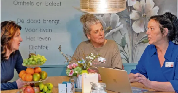 Tabak onderschrijft het belang daarvan. ,,Er beginnen binnenkort twee vrijwilligers. Het is dan aan ons om die goed op te vangen, want er komt veel bij kijken.” Van der Plas knikt: ,,Je vraagt namelijk iets anders van vrijwilligers dan bij een gewone woon-zorgafdeling. De gesprekken gaan hier over het einde van het leven. Veel vrijwilligers zijn wat ouder, dus dat is soms confronterend. Het is belangrijk dat je elkaar daar intern in opvangt.”