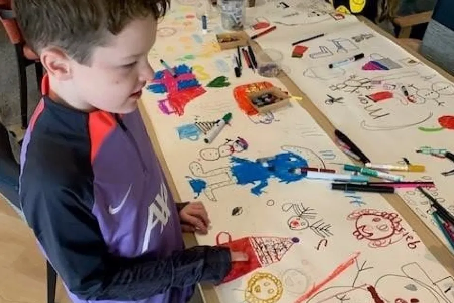 Het project ’Tafeltekenen met senioren’ is woensdagochtend goed voor zo’n achtentwintig meter winterfeest. Vier stroken van zeven meter liggen vastgeplakt op de tafels in een vertrek van Meerstate. Leerlingen van groep 5 van de St. Leonardusschool en bewoners van het zorgcentrum tekenden gezamenlijk de winter waar iedereen van droomt. Honderden kleurpotloden, stiften en wascokrijtjes liggen op de lange tafels waar gezellig gekletst en getekend wordt.